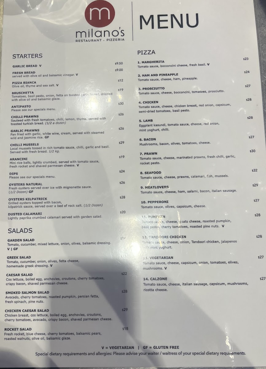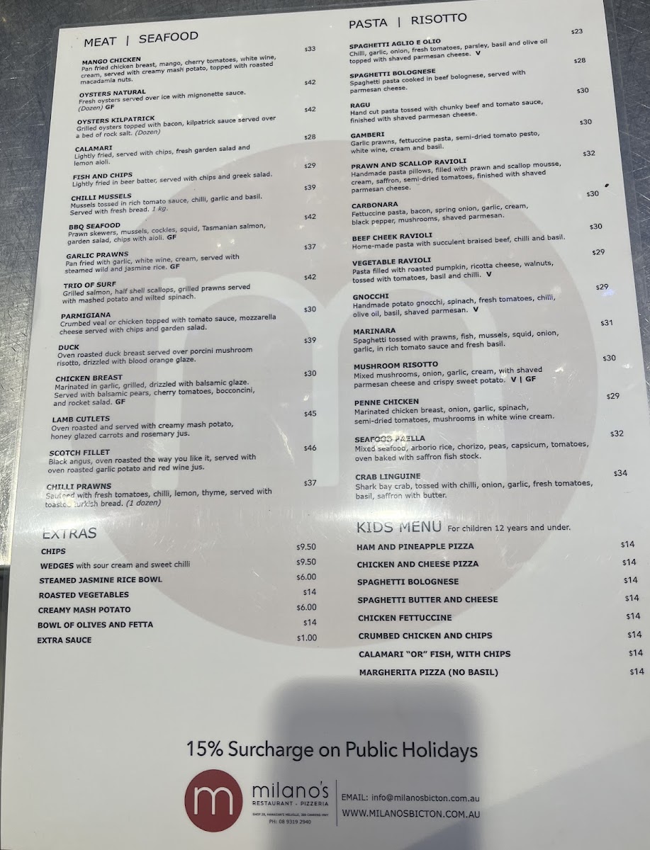 Children are also catered for with a dedicated kids menu featuring favorites like Ham and Pineapple Pizza and Spaghetti Bolognese, all priced reasonably at A$13.20. Pair these with flavorful extras like crispy garlic bread or roasted vegetables for a complete experience. The attentive staff adds to the welcoming ambiance, emphasizing customer satisfaction. Whether you're indulging in a lavish dinner or a light lunch, Milano's promises a culinary journey that’s both delicious and memorable.